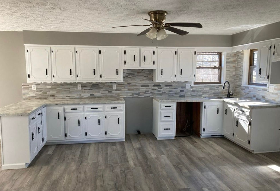 A collection of images showcasing modern kitchen designs with white cabinets, gray backsplash, wooden floor, and ceiling fan.